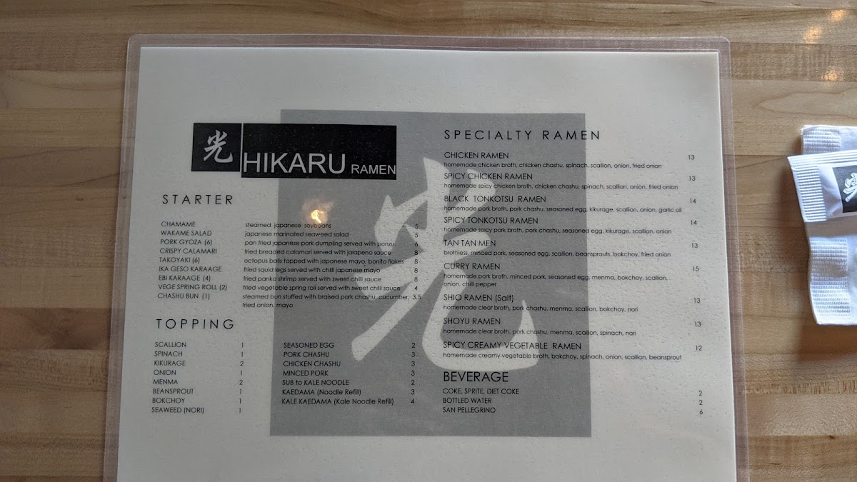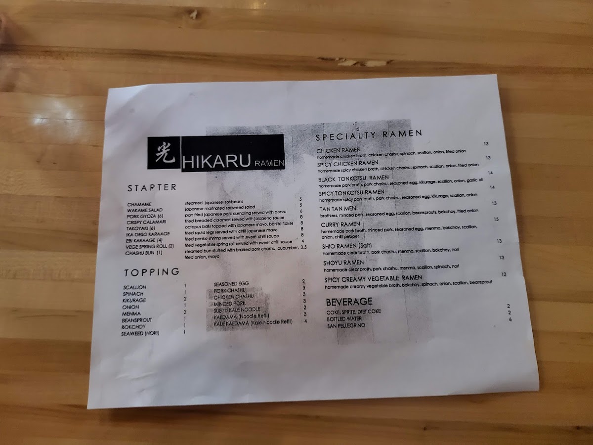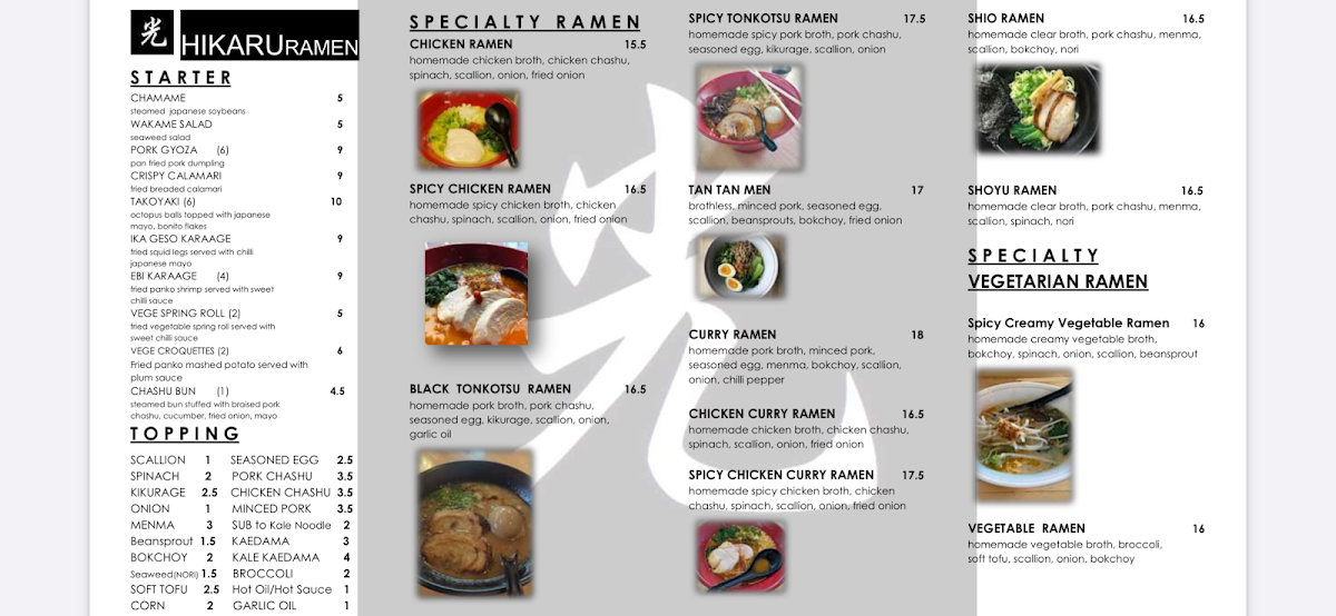 Hikaru Ramen Menu